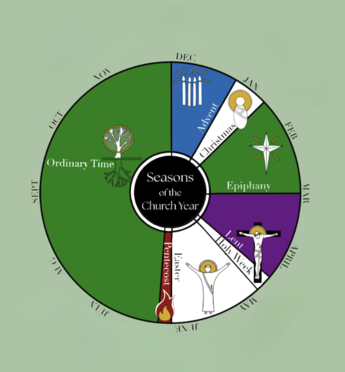 Did you know that the church year has seasons? Just like the calendar year has winter, spring, summer, and fall, the church year has seasons like Advent, Christmas, Epiphany, and more. Right now, we are in the 50 day long season of Easter. You can see how the year flows in the graphic below.