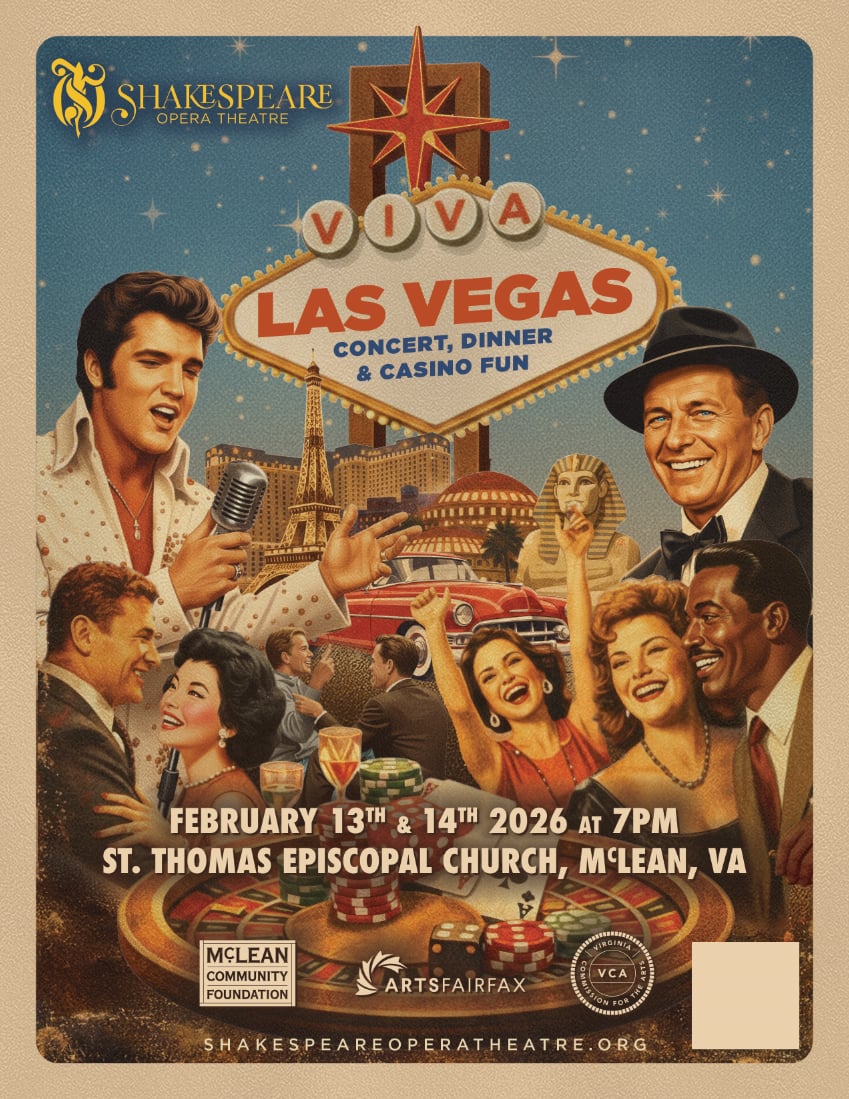 Shakespeare Opera theatre kicks off their 2026 Season of America 250 with Viva Las Vegas! February 13 & 14 at 7 PM, It’s a celebration of the Great American Songbook in concert, featuring five of our opera regulars and our own Dr. Lisa Bloy at the piano, plus visits from Frank Sinatra and Elvis! Italian buffet dinner, cash bar and exciting casino games round out this evening of fun. Come with your sweetheart or party with all the singles. We guarantee a Rat Pack of a good time! Tickets (includes dinner): $49.50.
